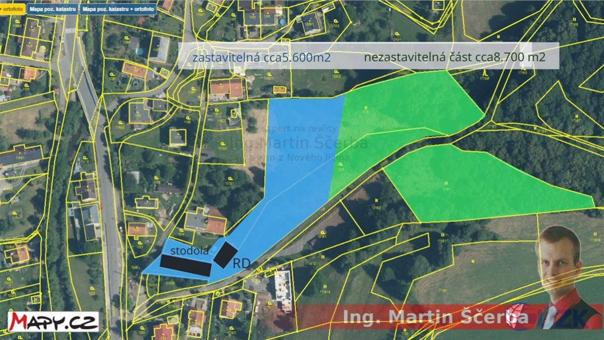 Z celkové plochy 14.300m2 je dle ÚP zastavitelné 5.600m2 a nezastavitelná část 8.700m2. Potenciál zde může najít chovatel koní, dobytka i skotu, stejně jako investor pro vybudování 4-5 rodinných domů.